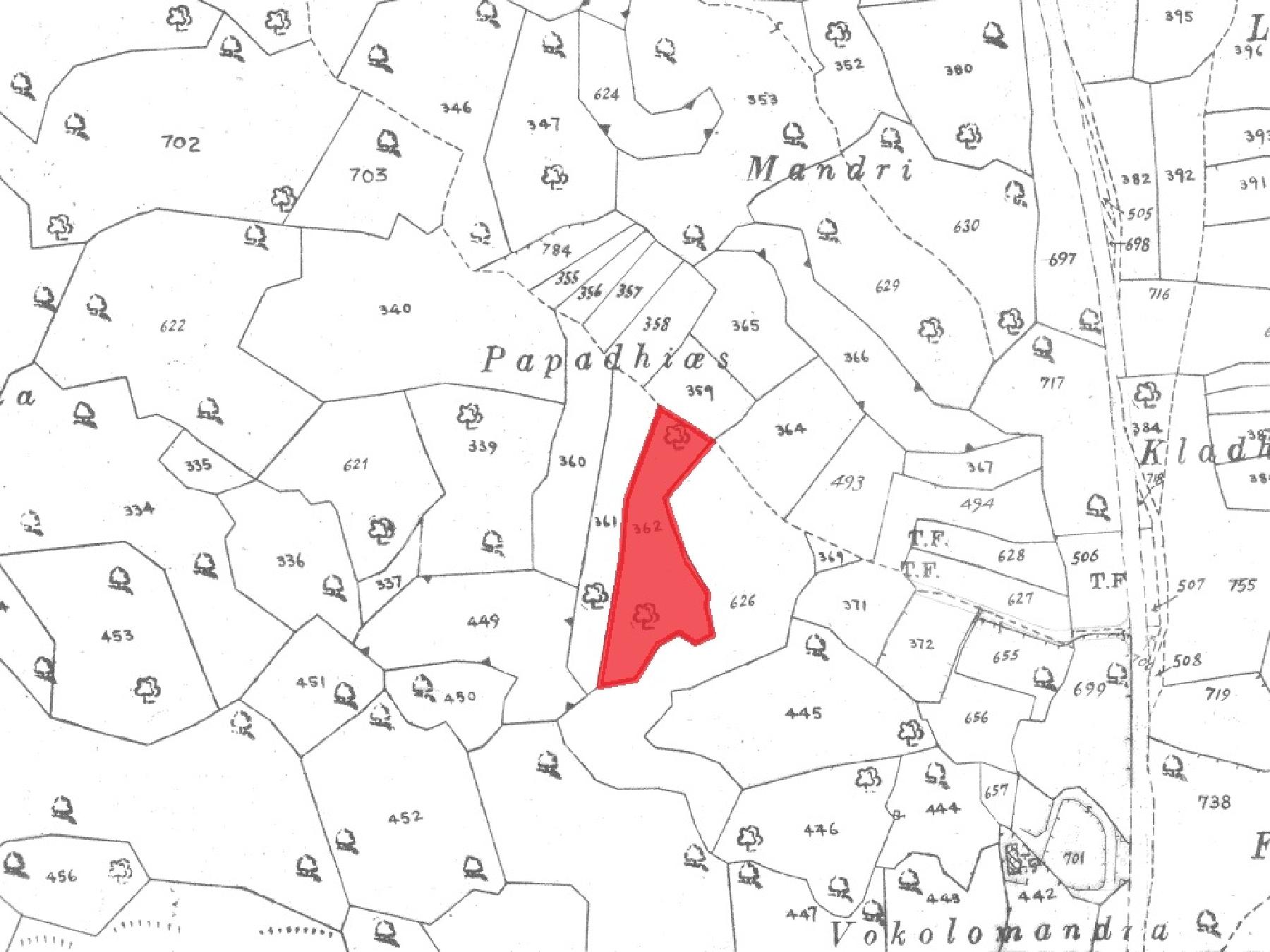 Διαθέτει ακανόνιστο σχήμα και επίπεδη επιφάνεια με μερικώς ανώμαλη τοπογραφία. Να σημειωθεί ότι πρόσβαση στο ακίνητο επιτυγχάνεται μέσω μη εγγεγραμμένου χωματόδρομου το οποίο είναι εγγεγραμμένο μονοπάτι. Επί του τεμαχίου υπάρχουν φυτείες με αμπέλια.