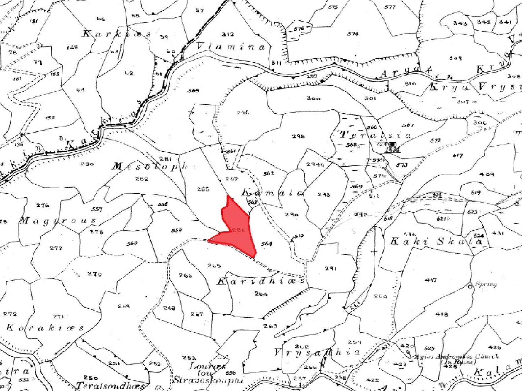 Agricultural field in Thrinia community of Paphos district. It is situated at a distance approximately 1.5km southwest of the community center.